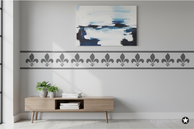 Die Kategorie unserer Classic Bordüren steht für zeitlose Ästhetik. Dieses Motiv besticht durch harmonische Linienführungen, die an antike Friese und herrschaftliche Dekorationen erinnern. Dank der durchdachten Rapport-Markierungen lässt sich das Muster unendlich fortführen, sodass Sie nahtlose Bordüren über die gesamte Wandlänge erstellen können.Warum eine Schablone vom Schablonenprofi?